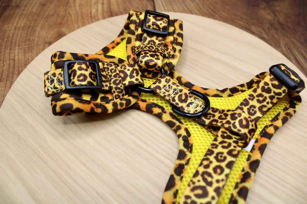 Golden Leopard Dog Harness Our Golden Leopard Dog Harness features a natural animal print in the leopard pattern.